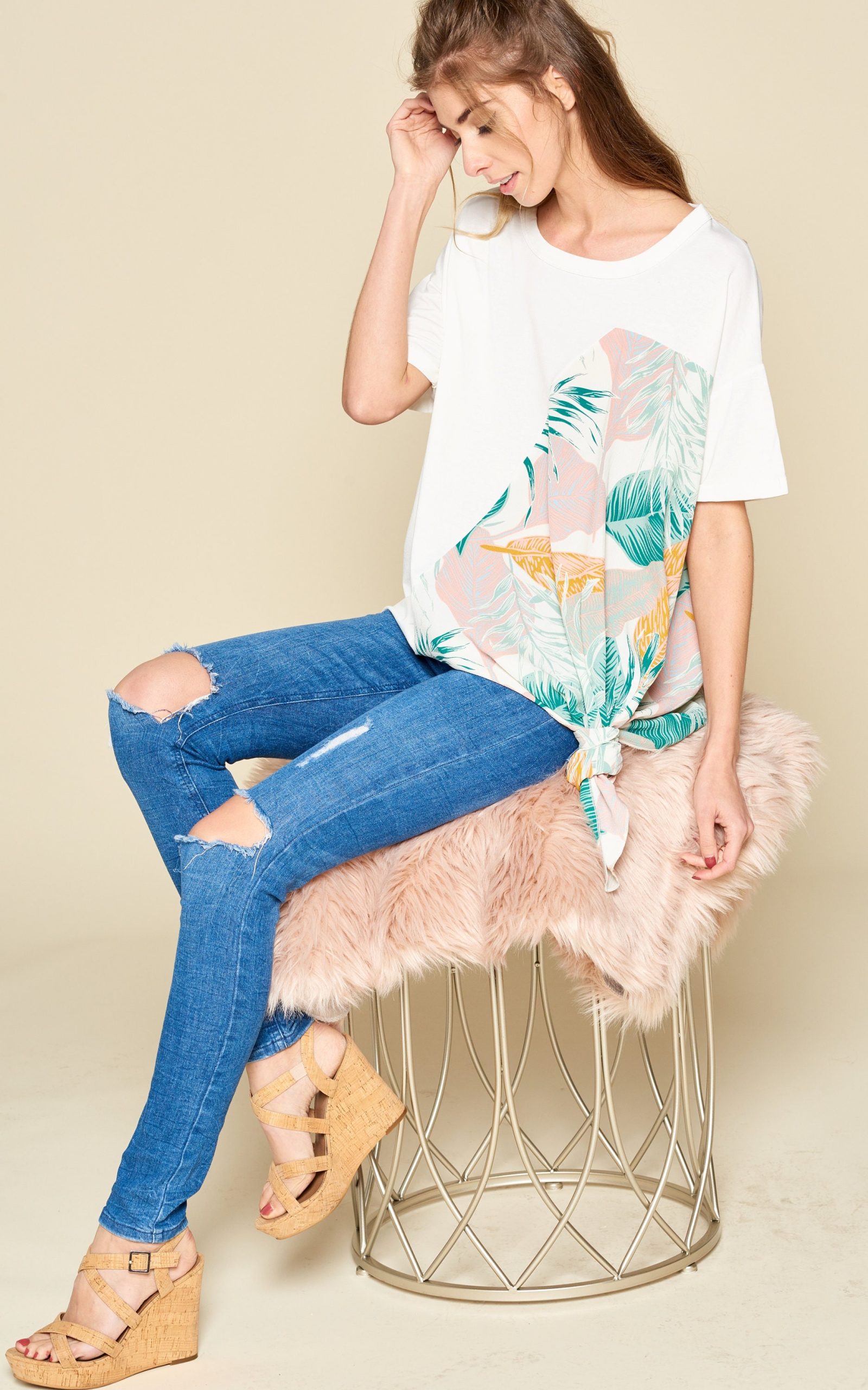 Comfy oversized short sleeved top featured with bubble fabric, tropical print, and side tie details.